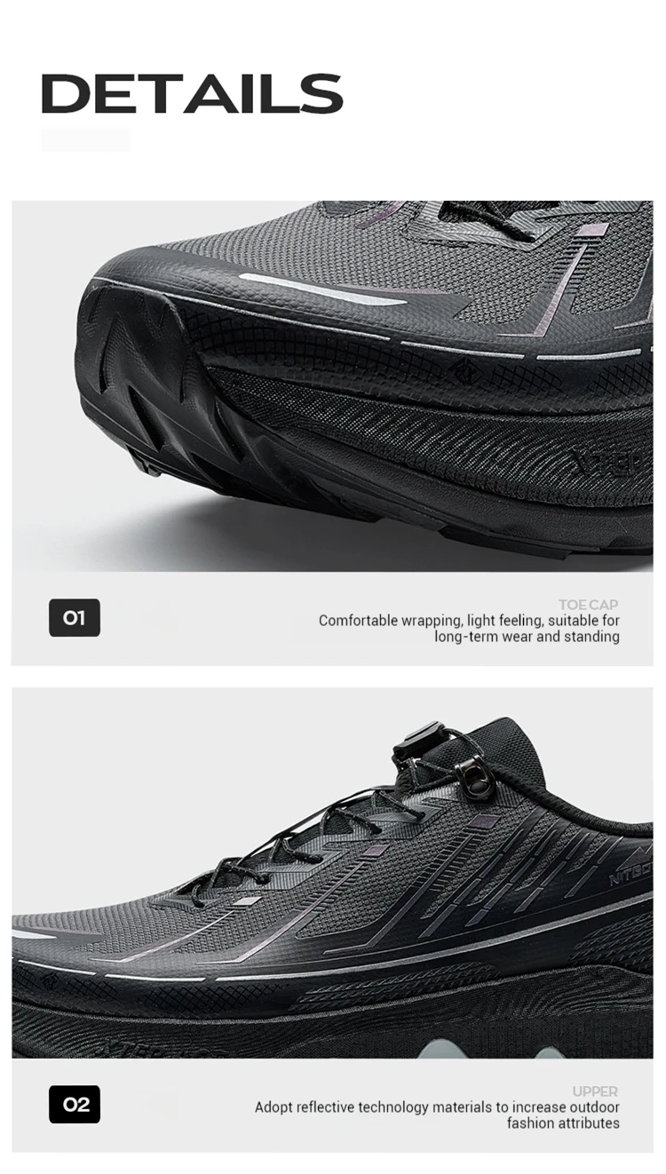 Kunlun 2.0:The toe area is comfortable and snug, with a light feel. It is suitable for long-term wearing and standing. The upper part of the shoes,It adopts reflective technology materials to enhance the outdoor trendy attribute. The upper layer of the outsole is equipped with XTEP ACE technology and the lower layer with feather technology, with an embedded TPU design